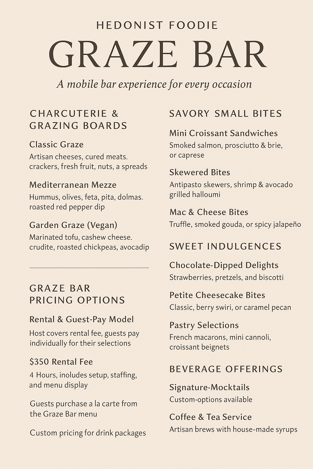 Indulge in a one-of-a-kind grazing experience with The Hedonist Graze Bar! From handcrafted charcuterie boards to personalized add-ons, we’ll bring the flavors and fun directly to your event.
